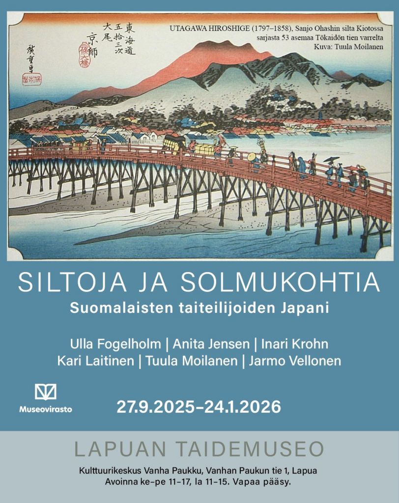 Japani kiehtoo mielikuvitustamme tavalla, mihin mikään muu maa tai kulttuuri ei pysty. Monet suomalaiset taiteilijat ovat matkustaneet maassa, opiskelleet Japanin perinteisiä taidemuotoja ja inspiroituneet sen ainutlaatuisesta hengestä. Lapuan taidemuseossa syyskuussa 2025 avautuvassa näyttelyssä kuusi eturivin taiteilijaa tähyää itäiseen horisonttiin. Näyttelyn antiikkiset ukiyo-e puupiirrokset tarjoavat myös näyttelyvieraalle kurkistusikkunan vanhan Japanin hurmaaviin maisemiin.